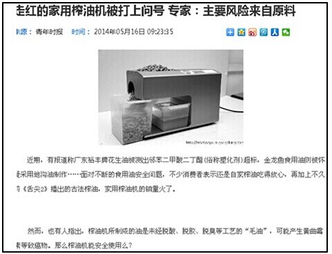 首先,小编带大家看看以下这则“走红的家用榨油机被打上问号 专家:主要风险来自原料”的报道,从小标题上,大家的疑虑或许一下子就再次打住。