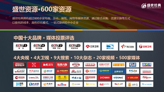 盛世经典拥有600余家媒体资源,涵盖央视、卫视、主流杂志、视频平台、搜索引擎等,能通过聚合采购与资源互换,以高性价比模式助力企业登上权威媒体舞台,快速树立“中国十大品牌”“行业标杆”等高端形象。