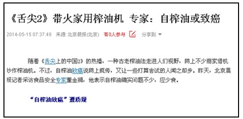 小编其实想说《舌尖2》这个节目又何其只是带火了家用榨油机,为什么偏偏要将家用榨油机作为单品揪出来加以炒作?炒作的用意何在?是有意诋毁还是无意为之?