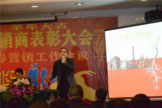 慷慨激昂的致辞结束之后,由技术研发部副经理王冰先生为与会者介绍了最新“工程涂料新品”,天然彩色真石漆、外墙质感涂料、水性多彩漆,硅藻泥涂料防水涂料技术。并分别对“外墙工程涂料(天然彩色真石漆、外墙质感涂料、水性多彩漆),内墙硅藻泥涂料,家装用防水涂料”,各产品的产品特性、应用范围及施工工艺作了全方位的阐述。