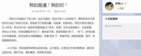 北京时间4月7日17时,你通过个人微博正式宣布退役。