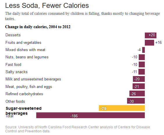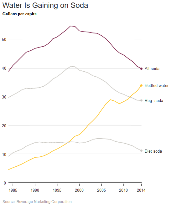 美国政府的数据显示,从2007年到2013年,青少年中间的苏打消费减少了20%。越来越多的人倾向 选择瓶装水。致使碳酸软饮料持续下降的原因是对健康的担忧,含糖的饮料被认为导致超重的因素之一。一家大型苏打地区分销商称,他的业务每年缩小1.5%到 2%。