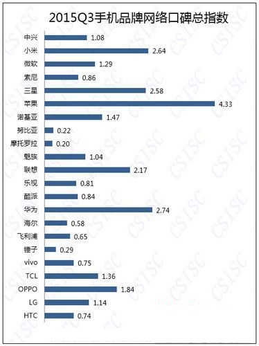 与2015年二季度相比,苹果在本季度发布新品iPhone6S获得较大关注,尤其是新品上市后,带动其它产品价格下降,消费者对iPhone4s等产品的购买力度也增加。华为手机的口碑指数名列亚军,超越小米,摩托罗拉、努比亚等手机口碑指数较低。