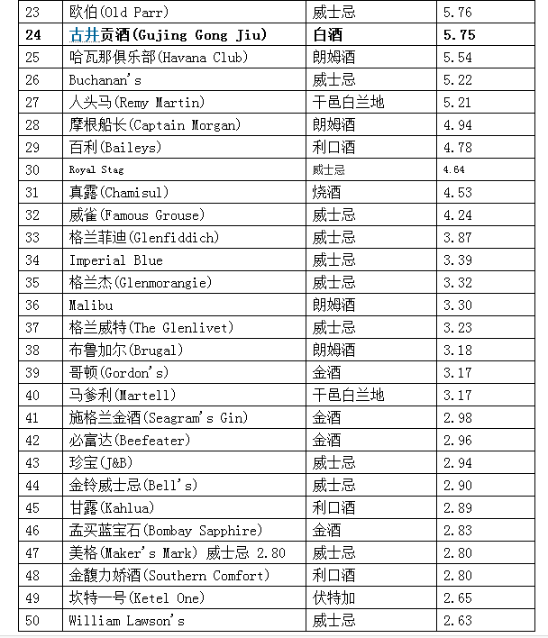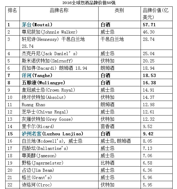 2016全球烈酒品牌价值50强榜单如下: