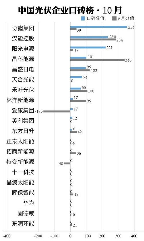 样本企业中的正泰太阳能、特变新能源、晖保智能、华为、东润环能等9家企业,在口碑榜信息采集库——包含传统媒体、新媒体、公众认知——压根就看不到他们的“踪迹”。但好在“10月榜单”没有任何一家企业进入负数的行列。