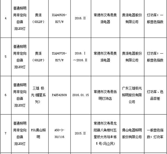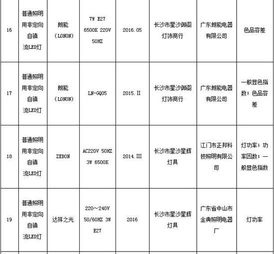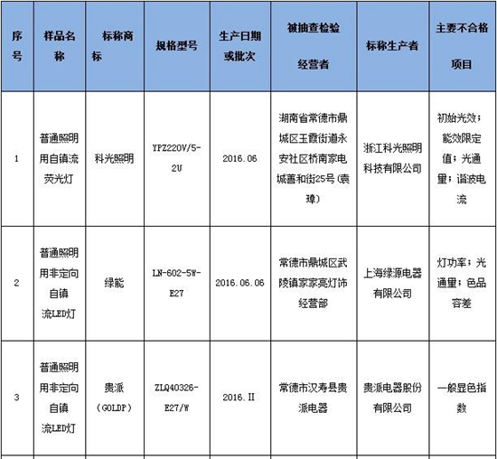 据本次发布的《不合格节能灯名录》,不合格样品的标称商标涉及科光照明、绿能、贵派(GOLDP)(3批次)、三雄.极光(耀星系列)、FSL佛山照明(2批次)、澳克士照明OKES(2批次)、汾江、迅一(XUNYI)、邦越光电、开尔、公牛、朗能(LONON)(2批次)、ZEBON、达祥之光、仁义照明(RENYI仁义)、达祥、美凌。