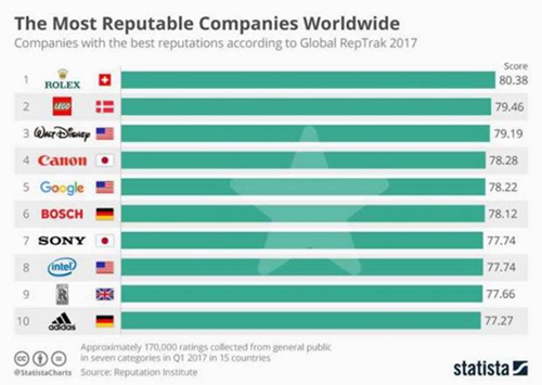 据Statista调查统计,全球名声最好的品牌或企业是以生产名贵手表见称的Rolex劳力士,第2和第3位则分别为LEGO乐高积木和Walt Disney迪士尼,而Canon佳能排在第四位,第5及第6位是自美国的Google谷歌及德国的Bosch博世。