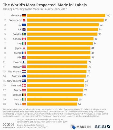 另外,Statista也公布了另一项十分有趣的统计数字,就是访问来自52个国家的43,000民众,投出最令人引以自豪的「XX 制造」。结果,德国以满分100夺得第一名,跟摄影人梦寐以求的神级摄影产品一样,将Made In Germany棒上神台,至于日本就以81分排名第 8,也是亚洲排名最高的国家。而近年在电子领域跟日本斗得你死我活的韩国,则连头20位都没排进来。