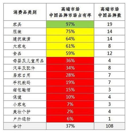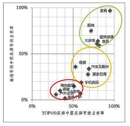 根据整体及高端市场表现,国货品牌可分为三组。一是国货品牌大众、高端市场双优——家具、服装、建筑装潢、大家电、食品5个消费大类;二是国货品牌大众市场占优——母婴、汽车与配件、居家日用、手机数码4个消费大类;三是国货有效供给不足——保健、户外运动、美妆个护、箱包鞋帽、小家电5个消费大类。