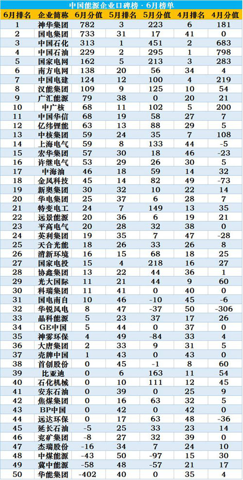 6月,口碑最高分值782(神华集团),最低分值-402(华能集团),两者相差1184,是5月的两倍多。
