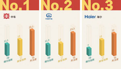 榜单显示,海尔的海外媒体关注度为22,仅次于中车、中铁。其中美誉指数为15,和中车一起位居全榜单并列第1。在境外媒体对海尔的报道中不乏溢美之词。