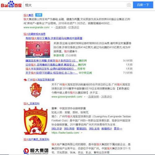 举例:恒大集团,当搜索恒大的时候,出现的是恒大的官网、各大媒体报道、百度百科、贴吧等内容,整个页面全部是积极正面的信息(肯定有负面的信息,这些信息被正面的所覆盖),看完整个页面后对于公司的实力、信誉度就不会有什么怀疑了,这个就是品牌互联网化的营销方式。