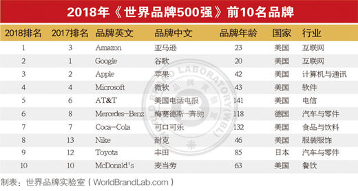 具体来看,世界品牌500强评出的全球前十大品牌分别为亚马逊、谷歌、苹果、微软、AT&T、奔驰、可口可乐、耐克、丰田和麦当劳。其中,美国品牌占了8个,日本品牌1个。