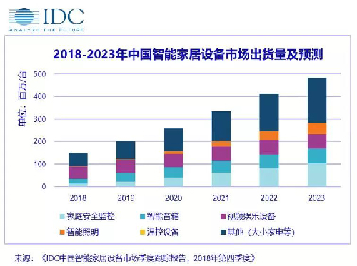 日前,IDC最新发布的《IDC中国智能家居设备市场季度跟踪报告》显示,2018年中国智能家居市场累计出货近1.5亿台,同比增长36.7%,其中第四季度出货4610万台,同比增长45.4%。预计未来五年中国智能家居设备市场将持续快速增长,2023年市场规模将接近5亿台。