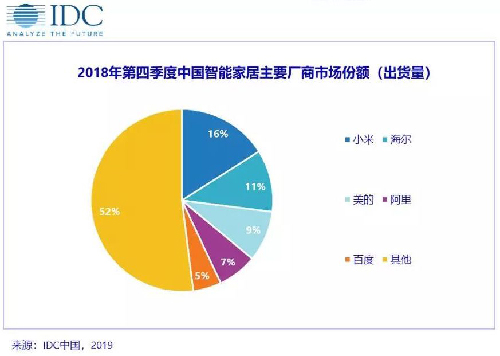 从市场竞争来看,中国智能家居设备市场玩家众多,头部厂商优势明显。《IDC中国智能家居设备市场季度跟踪报告》显示,2018年第四季度中国智能家居设备出货量前五位的厂商占有近半数的市场份额。其中小米依靠其完善的生态链成为最大玩家;海尔和美的作为传统家电智能化的领头羊分列第二、三位;阿里凭借自身渠道优势通过智能音箱和智能电视盒子两个主要产品位列第四;百度入局较晚,但在DuerOS语音平台的支持下通过智能音箱这一爆款产品,仅三个季度便跻身前五。