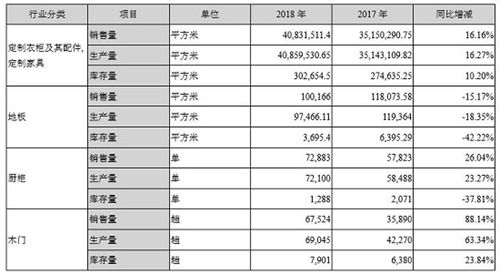 同时,索菲亚2018年年报显示,虽然地板和橱柜库存量较上年同期分别下降42.22%、37.81%,但其占营业收入82.90%的定制衣柜及其配件库存量反而同比上升10.20%,同时近几年新发力的木门领域库存量也同比上升23.84%。