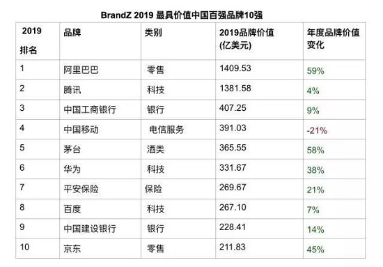 5月6日,WPP与凯度联合发布“BrandZ TM 2019最具价值中国品牌100强”榜单,阿里巴巴、腾讯、华为、百度、京东等排名前十。这几个耳熟能详的品牌,不仅在品牌财务和品牌贡献有突出表现,在全球范围也具有很高的认可度和影响力。