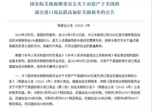 公告里指出,2019年5月9日,美国政府宣布,自2019年5月10日起,对从中国进口的2000亿美元清单商品加征的关税税率由10%提高到25%。