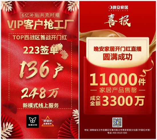 除此之外,索菲亚、维意定制、晚安等一众家居建材企业的所举办的线上活动,效果都超出预期。例如,索菲亚2019年,线上客户占比达25%,其中一线城市占40%以上,2019线上订单转化率16%;维意定制仅TOP西战区首战开门红便签单223,收款248万;晚安家居开门红直播,11000件家居产品全部售罄,终以3300万成交金额圆满收官...