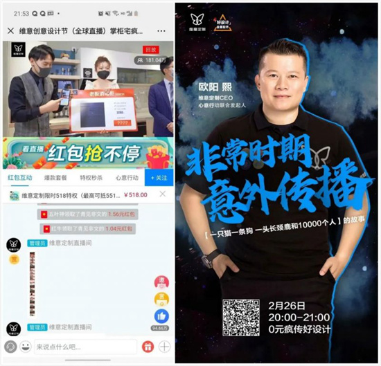 2月初,行业“老大哥”欧派家居重磅推出“开门红”活动,在线主推全屋定制22平米19800元,伴随系列优惠豪礼为消费者定制全屋六大空间。线上直播营销,欧派亦不落下风,2月13日,欧派橱柜在欧派官方直播平台、天猫、小程序(腾讯直播)、苏宁易购等四大平台同步举行直播,观看人数65万,下定超12365单。同时,其他产品线亦在线直播且频创佳绩。