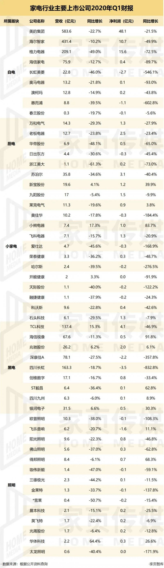 中国家电行业主要上市公司2020年第一季度业绩报告相继出炉,各版块营收以及净利润均下滑,受到疫情冲击明显。