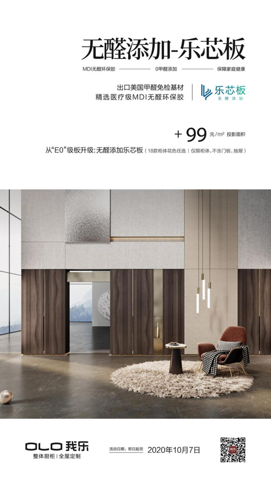 我乐家居对外表示,促销期内(即日起至2020年10月7日),达标用户可免费从“E0”级板升级到无醛添加乐芯板的福利,其它用户可享受每平+99元即可升级的普惠政策。欧派、索菲亚、尚品宅配的促销策略亦大同小异。