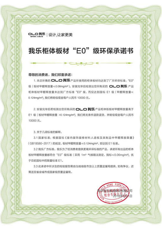 (我乐家居是目前唯一一家和消费者签订《“E0”级环保承诺书》的上市定制品牌)
