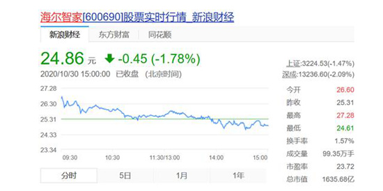 受海尔智家前三季度财报的影响,10月30日,海尔智家A股股价顺市下跌1.78%,截至当日收盘,海尔智家股价报24.86元,总市值为1635.68亿元。
