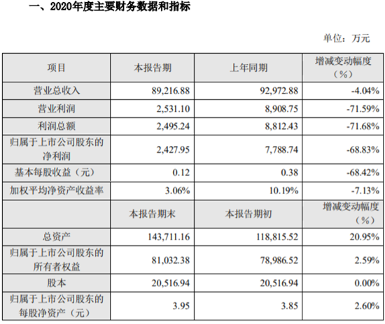1月29日,广东顶固集创家居股份有限公司发布了2020年度业绩快报。数据显示,2020年顶固总营收预计8.92亿,比上年同期减少4.04%;总盈利2531.10万元,归母净利润为2427.95万元。