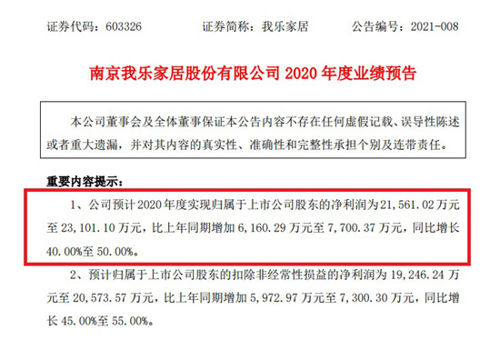 1月15日,我乐家居发布2020年度业绩预告公告。报告显示:预计2020年度归属于上市公司股东的净利润为2.16亿元至2.31亿元,比上年同期增加0.62亿元至0.77亿元,同比增长40.00%至50.00%。