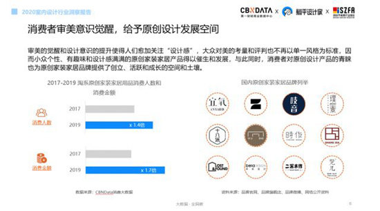 同时伴随着居民消费需求的升级,我国家居市场逐渐由功能驱动型消费转向重品质、重设计的情感消费阶段,审美的觉醒和设计意识的提升使得消费者愈加关注“设计感”。CBNData数据显示,近年来淘系原创家装家居用品的消费人数实现了四成增长,消费金额更是实现了七成的飞跃。