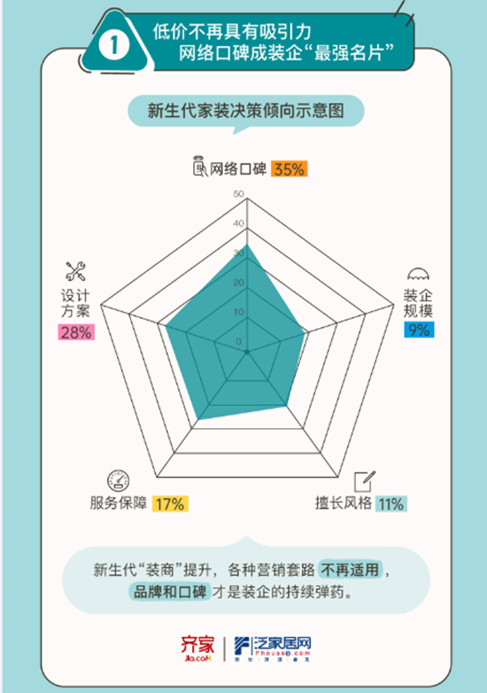 可收入的下降,并未影响业主在家装预算上的“节约”,反而有所上涨。随着年轻一代消费群体的崛起,家装行业正在悄然改变。不久前,齐家网发布的《2020疫后新生代家装消费十大势界观》报告显示,装修过程中,年轻人并不太重视预算,而更重视家装“颜值”的高低。“设计方案”、“擅长风格”等与家装颜值直接挂钩的属性均被列入了年轻人筛选装修公司时的TOP5考量因素,而价格因素并不在内。与此对应的是,年轻人装修预算明显高于老一辈,报告显示,12万正成为新生代的装修门槛。
