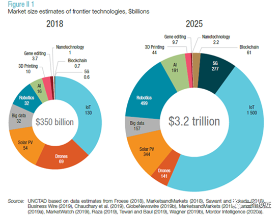 据估计,前沿技术已经代表了3500亿美元的市场,到2025年,这个市场的规模可能会超过3.2万亿美元。从这个角度来看,目前全球笔记本电脑市场的规模为1020亿美元,智能手机市场的规模为5220亿美元。
