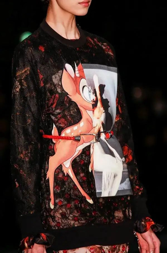 除了自创卡通形象作为IP,另一个常用的营销方式是和已有名气的卡通IP联名,奢侈品行业尤为常见。Givenchy在2013年推出的小鹿斑比系列,被视为奢侈品品牌联名卡通IP的先行者,此后,Louis Vuitton、Loewe 、Gucci等品牌和卡通形象联名更是不断。