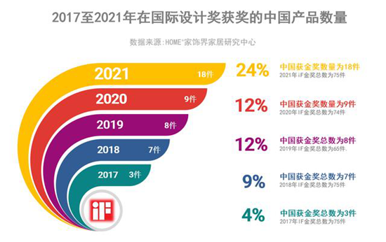 以德国iF设计奖为例,它是目前全球最权威、影响力最大的工业设计奖项之一,素有“设计奥斯卡”的美誉。HOME+家饰界家居研究中心统计了2017年至2021年荣获国际设计奖IF金奖的中国产品数量,2017年仅有3件,占金奖总数的4%;五年来,中国产品的金奖数量及比例都呈连年上升趋势,到2021年,达到了18件,比例升至24%。