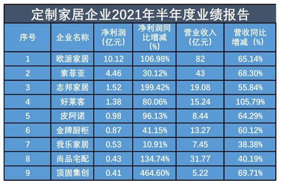 新京报记者对比发现,与2020年上半年相比,今年上半年定制家居企业排名出现细微变化。不过,行业整体向好,增速均大幅提升。