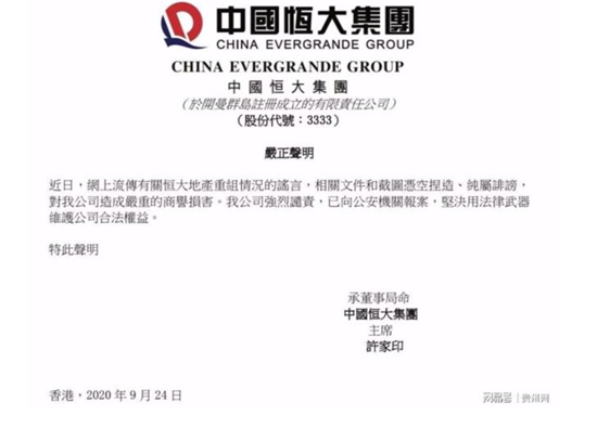 “近日,网上流传有关恒大地产重组情况的谣言,相关文件和截图凭空捏造,纯属诽谤,对我公司造成严重的商誉损害。我公司强烈谴责,已向公安机关报案,坚决用法律武器维护公司合法权益。特此声明。承董事局命,中国恒大集团主席,许家印,香港.2020年9月24日。”