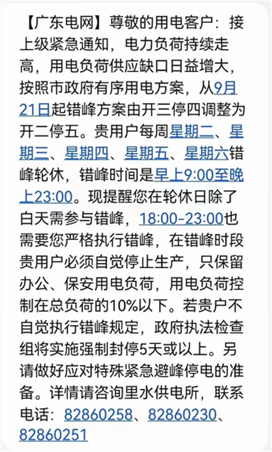 广东电网表示9月16日起执行“开二停五”用电方案,每周星期日、星期一、星期二、星期三和星期四实现错峰轮休,错峰日只保留保安用电负荷,保安负荷在总负荷的15%以下!