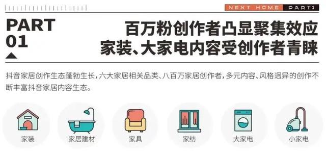 《报告》指出,目前六大家居相关品类,有超过800万风格迥异的家居创作者,从装修小白的避坑指南、足不出户的样板间案例、新潮的家具家电种草等等,越来越多的用户开始在抖音找寻家的温度,表达对家的理解。
