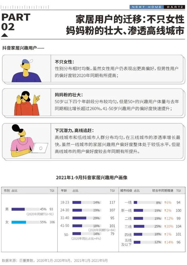 全面线上化的趋势也给行业带来了重大利好,不仅降低了企业的获客成本,提升了交易效率,还推动了家居内容生态的繁荣和家居兴趣用户的迁徙。数据显示,2021年1月-9月,有3.6亿用户对抖音的家居内容感兴趣,同比增长10%,其中观看家居视频的用户群体,男女比例接近45:55,41-50岁妈妈粉的偏好度迅速提升,高线用户的偏好度较去年同期有所提升。18-23岁群体对家电内容视频的偏好度较高,24-40岁用户对家居建材领域相关内容偏好日益提升,对美好居家生活的追求,正在变得日常化。