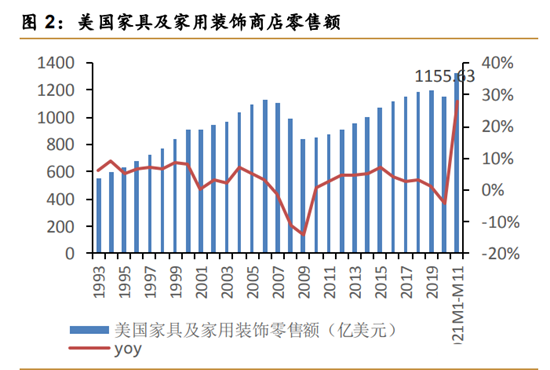 美国家装市场消费分为建材和家居消费,建材消费主要包含五金、木制家具、卫浴瓷砖等基础装修耗材;家居消费主要包含卧室、客厅、餐厅等空间的软体和配套家居,及窗 帘、软垫等家居装饰品。整体来看美国建材和家居市场增长平稳,根据 NHPA(北美建材 涂料协会)数据,2020年美国建材涂料等硬装产品零售市场规模为 4570 亿美元,2015- 2020 年复合增速为 6.2%。