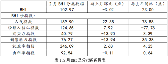 分析BHI各分指数情况:2月BHI环比小幅下跌,但其“人气指数”为189.90,环比上涨22.38点;而“购买力指数”值为40.79,环比下降13.90点,二者形成“看多买少”的状态。