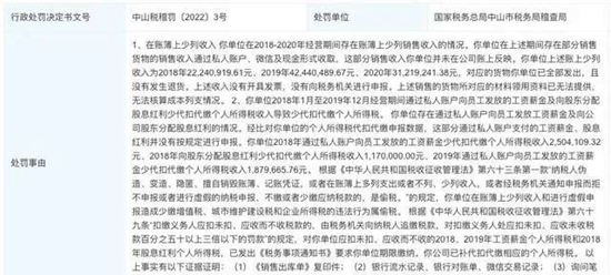 另一家中山格诺瓦家具有限公司也被大额罚款——826万元。格诺瓦家具在账簿上少列收入和进行虚假申报造成少缴增值税、城市维护建设税和企业所得税的同时,还通过私人账户向员工发放的工资薪金及向般东分否股息红利少代扣代微个人所得税收入导致少代扣代缴个人所得税。