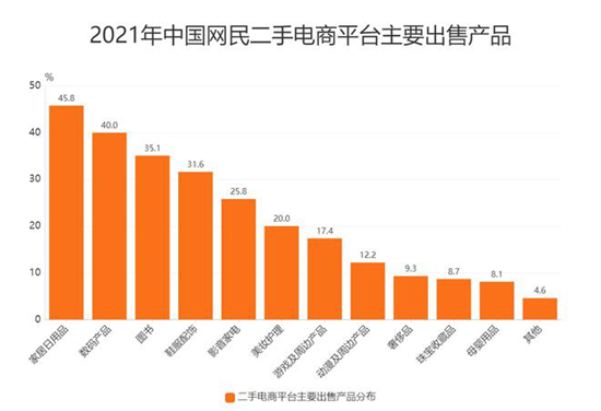 iiMedia Research(艾媒咨询)数据显示,网民在二手电商主要出售的产品中,排名前三依次为家居日用品、数码产品和图书,分别占比45.8%、40%和35.1%。