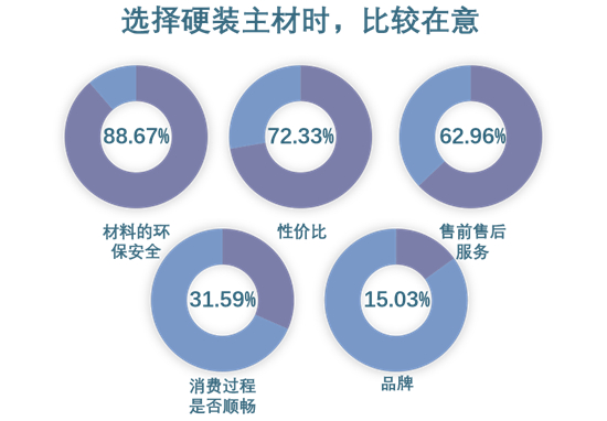 选购产品时,尽管对不同的产品类型,有不同的诉求,但是共性都是对环保要求极高。选择硬装主材时,材料的环保、性价比和售后服务是主要考量因素。