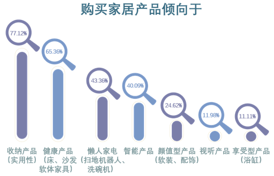 从消费者购买家居产品的倾向角度,也可以看出消费者对收纳和健康的需求,而软装成为装修公司配套产品对于消费者的吸引力并不大,也就说是装修公司即使提供配套产品,也可以从收纳产品、健康产品、懒人家电等角度考虑。