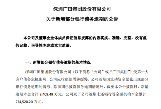 不仅是中小型企业,近期有装饰行业头部企业也深陷债务危机。7月18日晚间,广田集团公告称,受第一大客户债务危机影响,公司应收账款周转缓慢,公司近期因流动资金紧张出现部分银行债务逾期的情形,除前期已披露债务逾期情况外,截至公告披露日,新增逾期本金合计0.84亿元;公司及子公司逾期未还银行等金融机构本金累计27.45亿元。