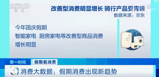 CCTV2《第一时间》栏目“假期看消费 消费大数据”专题报道,来自京东平台的数据显示,今年国庆假期,智能家电、厨房家电等改善型商品消费增长明显。假期前三天,洗鞋机销售额较去年双十一假期增长7倍,烘干机、洗地机也取得约3倍增长。