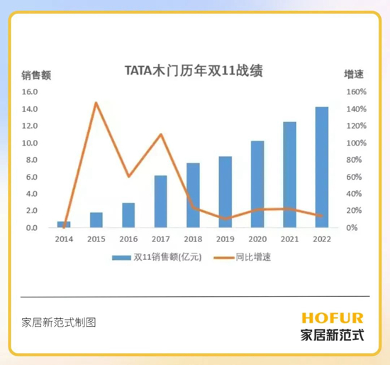 TATA木门的双11业绩走势或许可以代表大部分家居品牌的状况。在其20年的电商之路中,尽管TATA双11全网累计销售额位列天猫平台全屋定制品类TOP1、入户门品类TOP1,但增速则由最初的147%回落至14%。