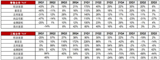 2022年疫情影响线下出行,客流量下滑拖累单店收入增速,预计未来逐步放开后,货物和人员流动更加顺畅,板块整体营收增速将回升,但是恢复节奏慢于2020年,主要是考虑到明年春节临近,装修刚需大概率被延迟至节后爆发,因此关注春节后开门红、315大促活动的各公司接单状态,并结合同期基数以判断线下零售端弹性。